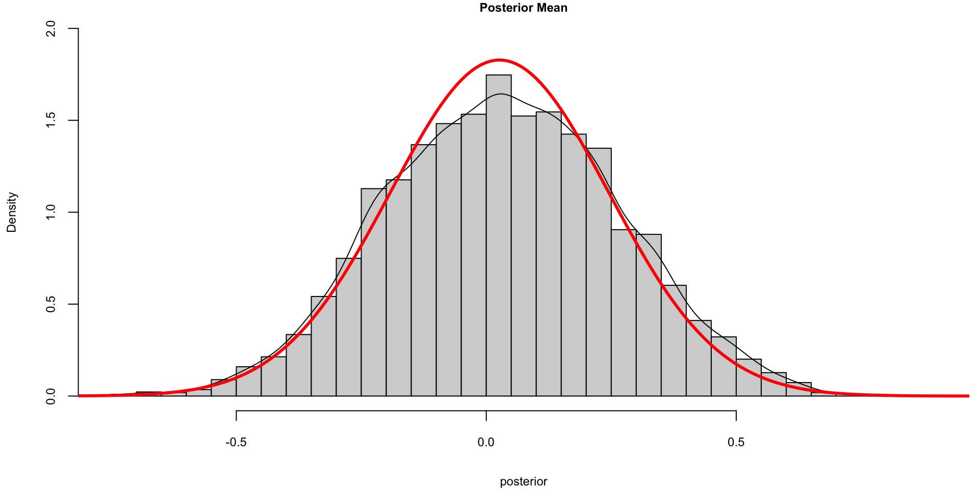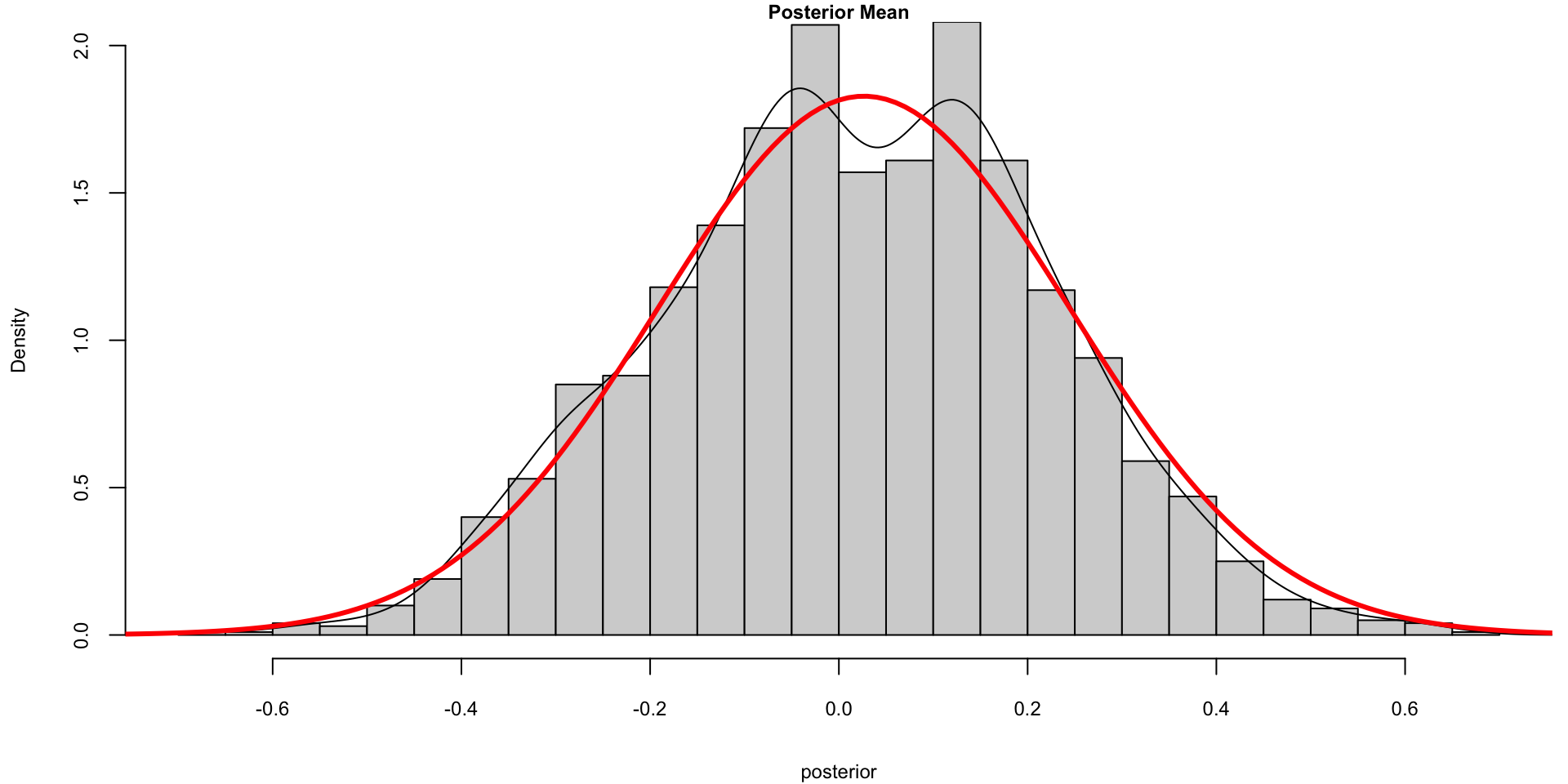 lines(density(posterior), ylim=c(0,2), main="Posterior Mean")