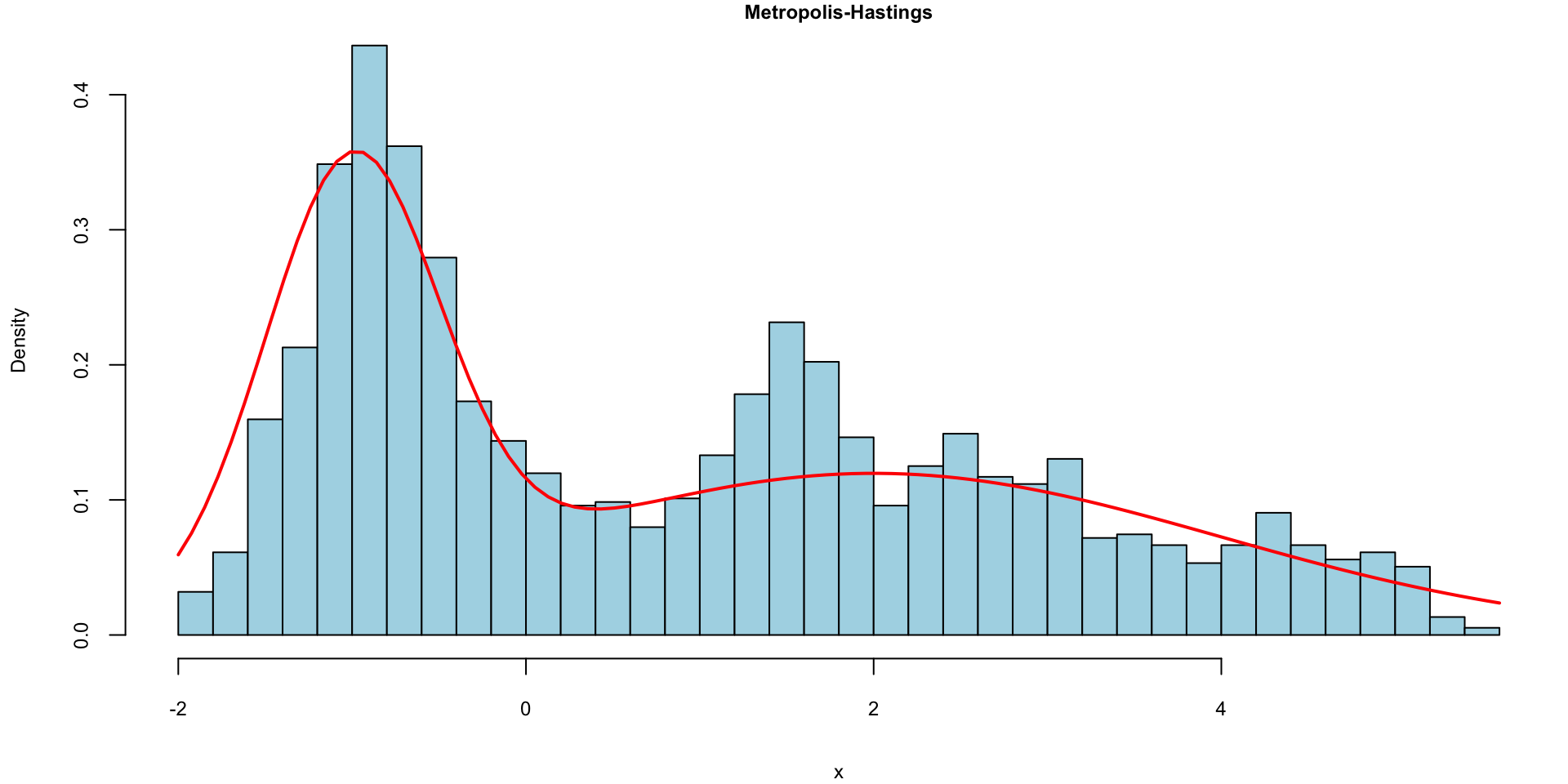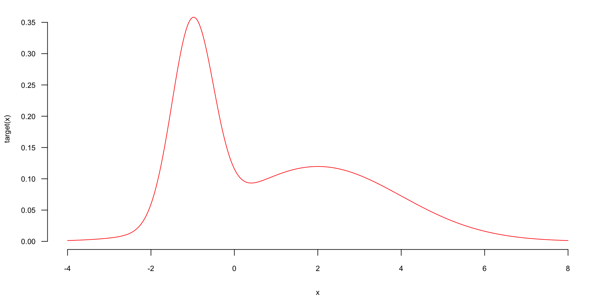 lines(x,dpost, type='l', lwd=3, col='red')We can simulate the evolution over time of the Hamiltonian dynamics of this system via the “leapfrog” integrator, which proceeds according to the updates \[ \begin{aligned} r^{+/2} & = r + (\epsilon/2) \nabla_{\theta}L(\theta) \\ \theta^{+} & = \theta + (\epsilon/2) r^{+/2}\\ r^{+} & = r^{+/2} + (\epsilon/2)\nabla_{\theta}L(\theta^{+}). \end{aligned} \]