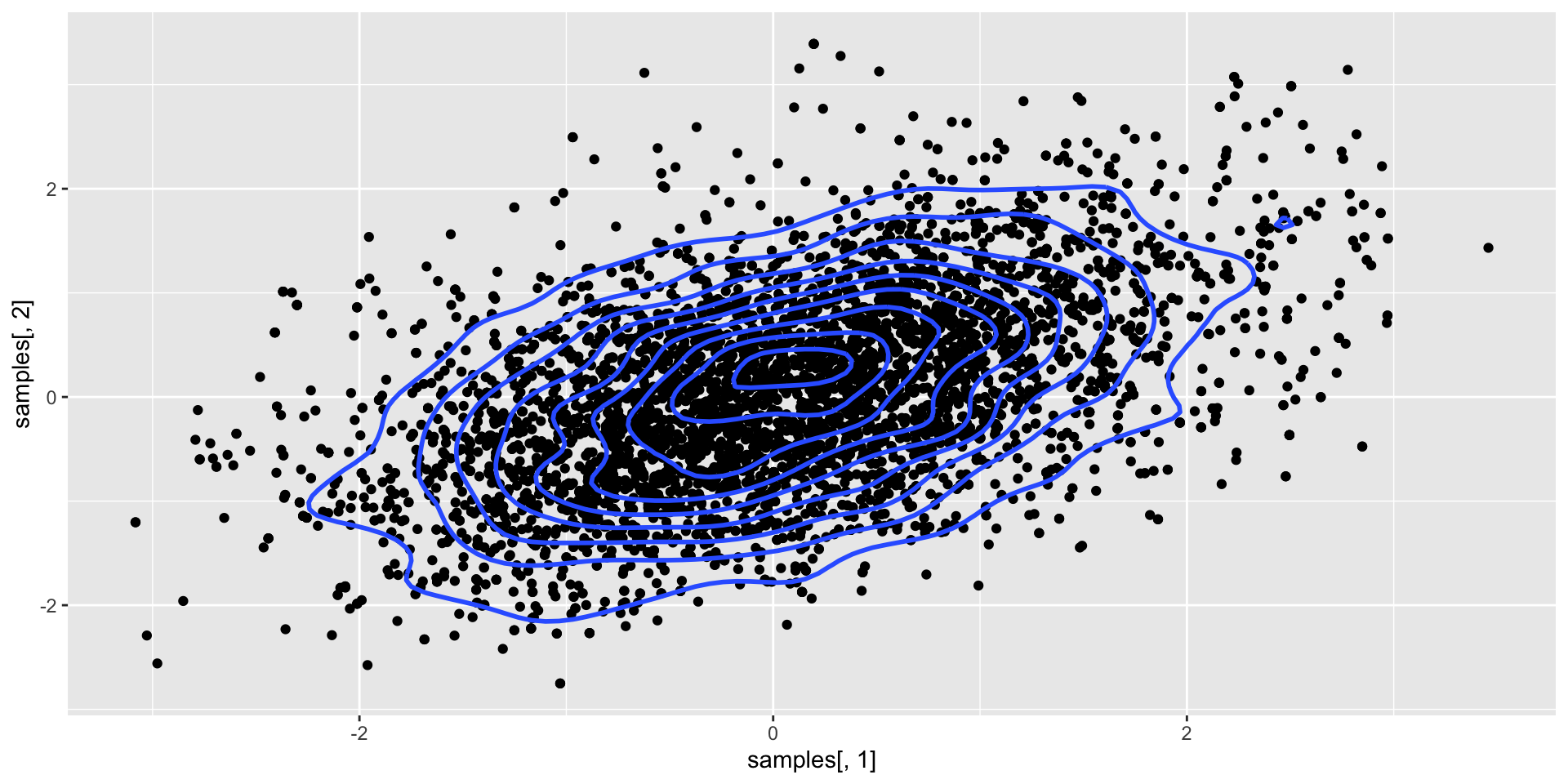 Normal \(N(0,I_2)\): \(x_1,x_2\) uniform on \([0,1]\) then \[ \begin{aligned} y_1 = & \sqrt{-2\log x_1}\cos(2\pi x_2)\\ y_2 = & \sqrt{-2\log x_1}\sin(2\pi x_2) \end{aligned} \]