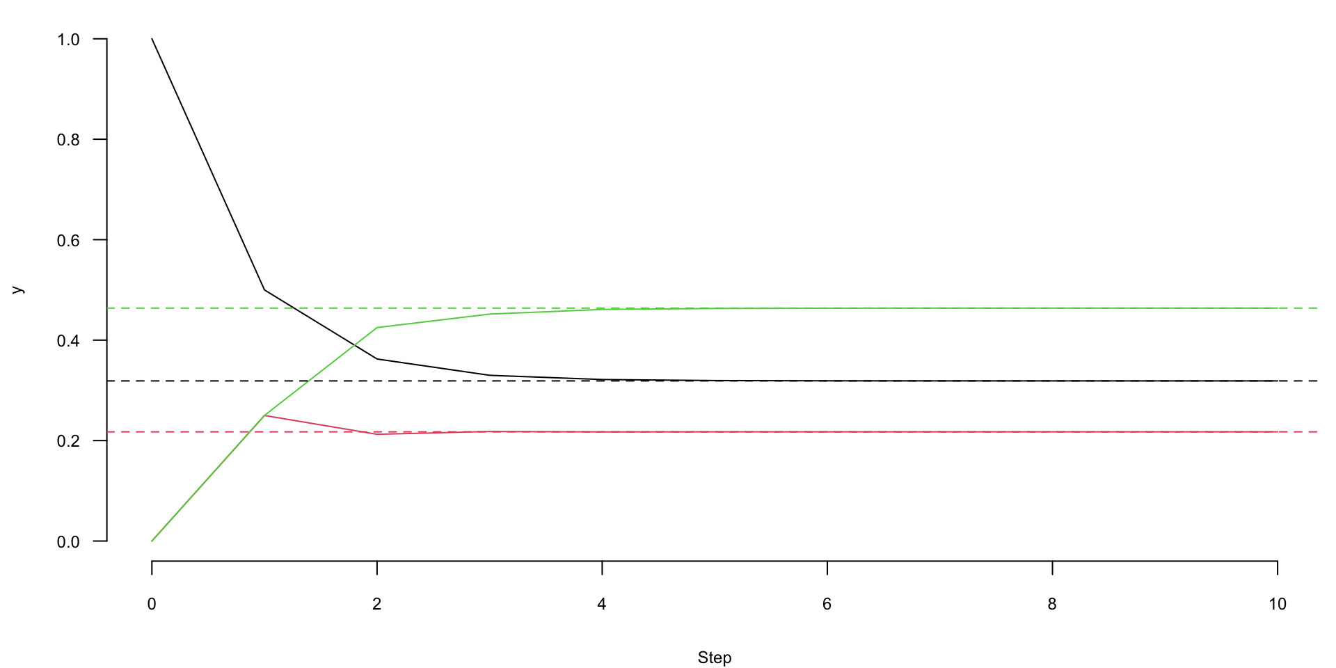 Let’s start with a random vector \(x = (1, 0, 0)\) and iterate \(x \leftarrow P x\) for \(n=10\) steps.