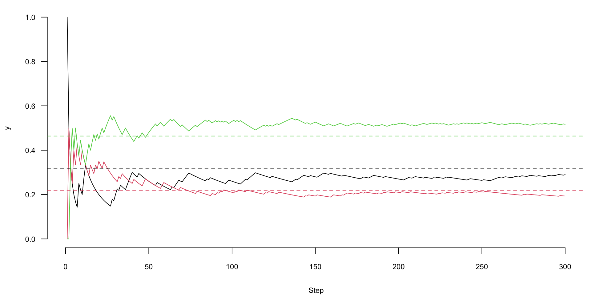 Power iterations convergence to eigenvector. Each color corresponds to a component of the eigenvector (stationary distribution vector)