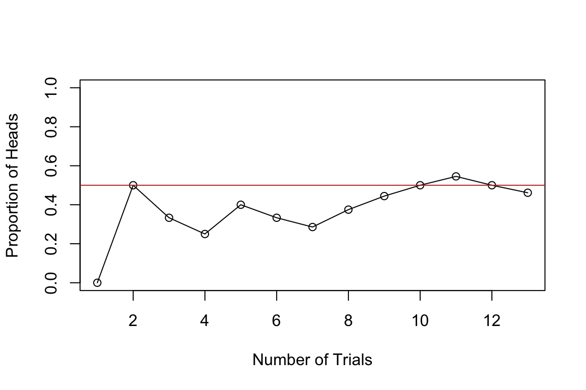 Assigning probabilities to events is a challenging problem. Often, the probability will be applied to analyze results of experiments (observed data). Consider the coin-tossing example. Say event \(A\) represents a Head. Then, to empirically estimate \(P(A)\) we can repeat the tosses experiment \(N\) times and count \(n\), the number of times \(A\) occurred. The plot below shows the proportion of heads after \(N\) trials.