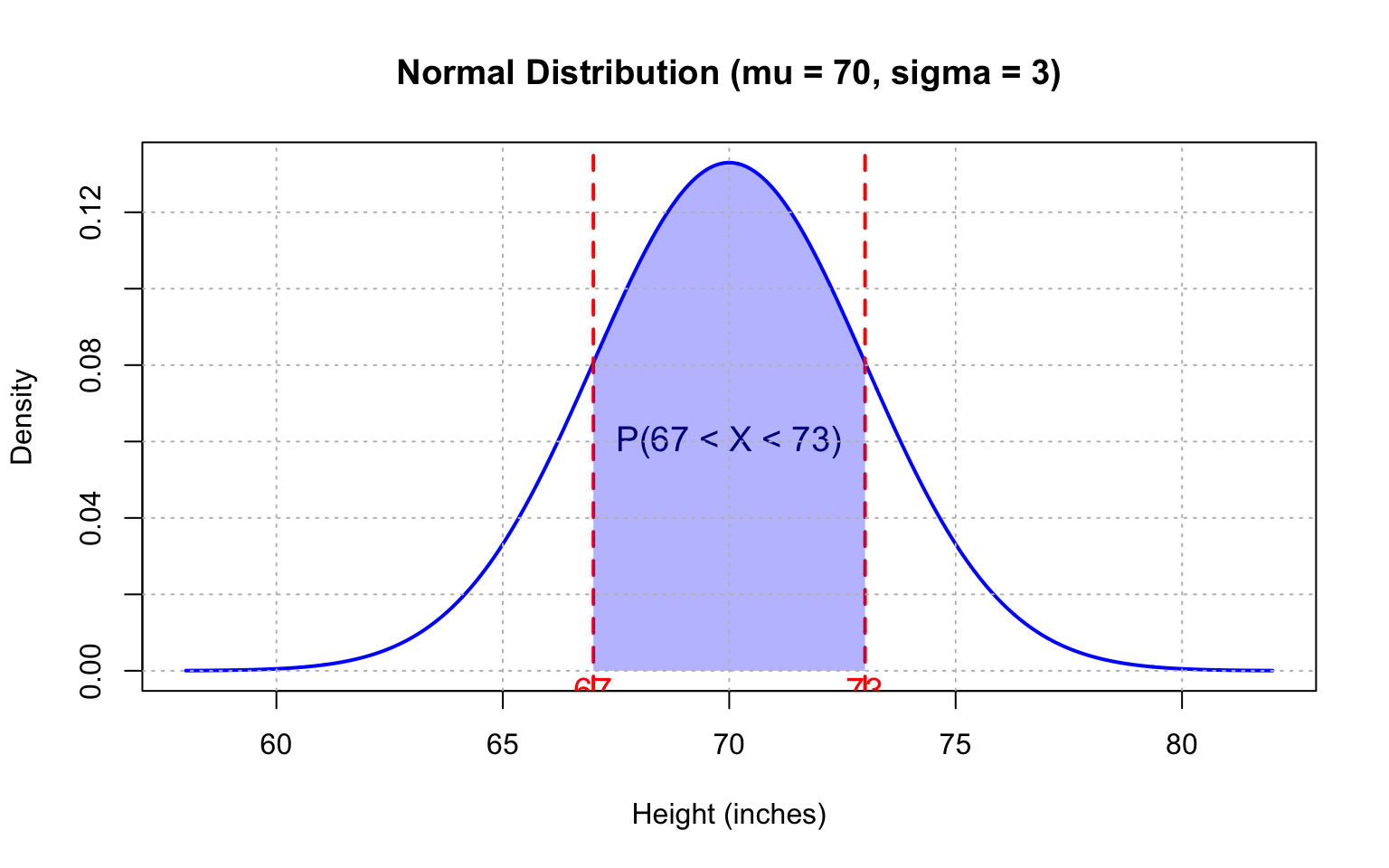 cat("P(67 < X < 73) =", round(prob_between, 4), "\n")## P(67 < X < 73) = 0.68