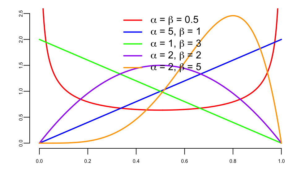 | Beta | \(\alpha, \beta\) | \(\frac{\Gamma(\alpha + \beta)}{\Gamma(\alpha)\Gamma(\beta)}x^{\alpha-1}(1-x)^{\beta-1}\) | \(\frac{\alpha}{\alpha + \beta}\) | \(\frac{\alpha\beta}{(\alpha + \beta)^2(\alpha + \beta + 1)}\) | \(x \in [0, 1]\) |