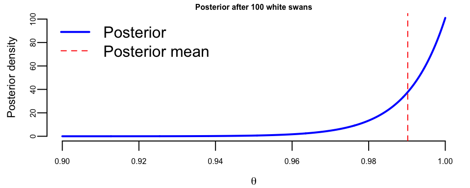 Example 3.2 (Black Swans) A related problem is the Black Swan inference problem. Suppose that after \(n\) trials where \(n\) is large you have only seen successes and that you assess the probability of the next trial being a success as \((T+1)/(T+2)\) that is, almost certain. This is a model of observing White Swans and having never seen a Black Swan. Taleb (2007) makes it sound as if the rules of probability are not rich enough to be able to handle Black Swan events. There is a related class of problems in finance known as Peso problems where countries decide to devalue their currencies and there is little prior evidence from recent history that such an event is going to happen.