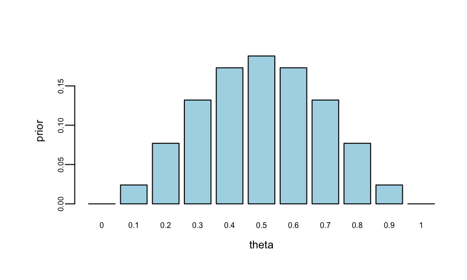prior <- c(0, 0.024, 0.077, 0.132, 0.173, 0.188, 0.173, 0.132, 0.077, 0.024, 0)3 Bayesian Learning