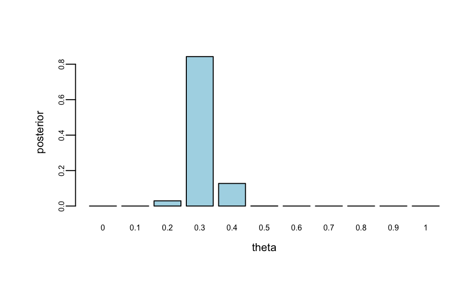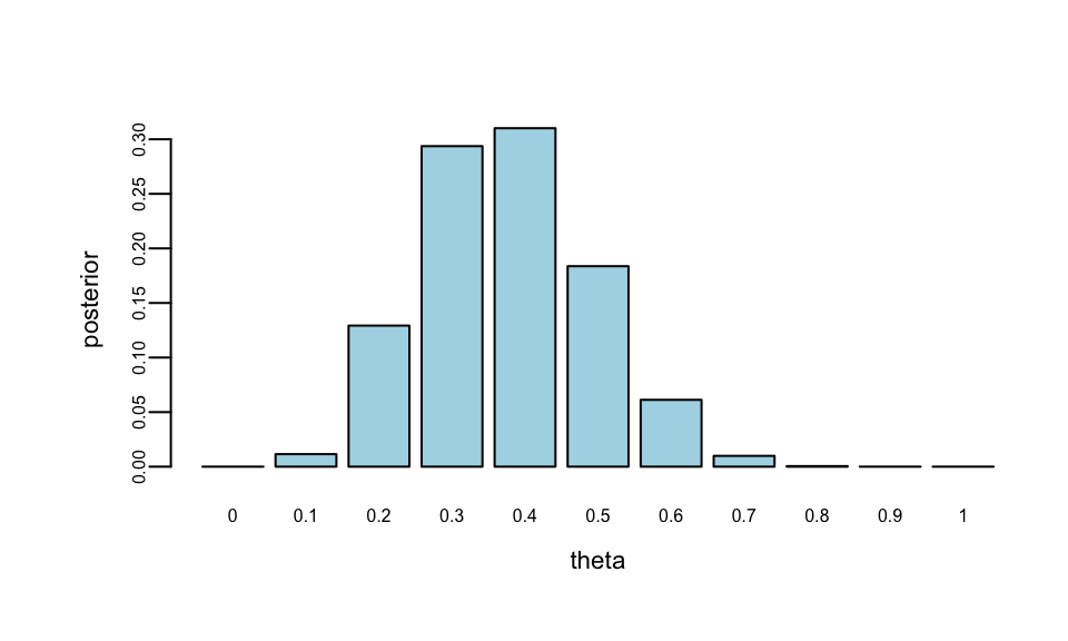 barplot(posterior, names.arg = theta, xlab = "theta", ylab = "posterior", col = "lightblue")