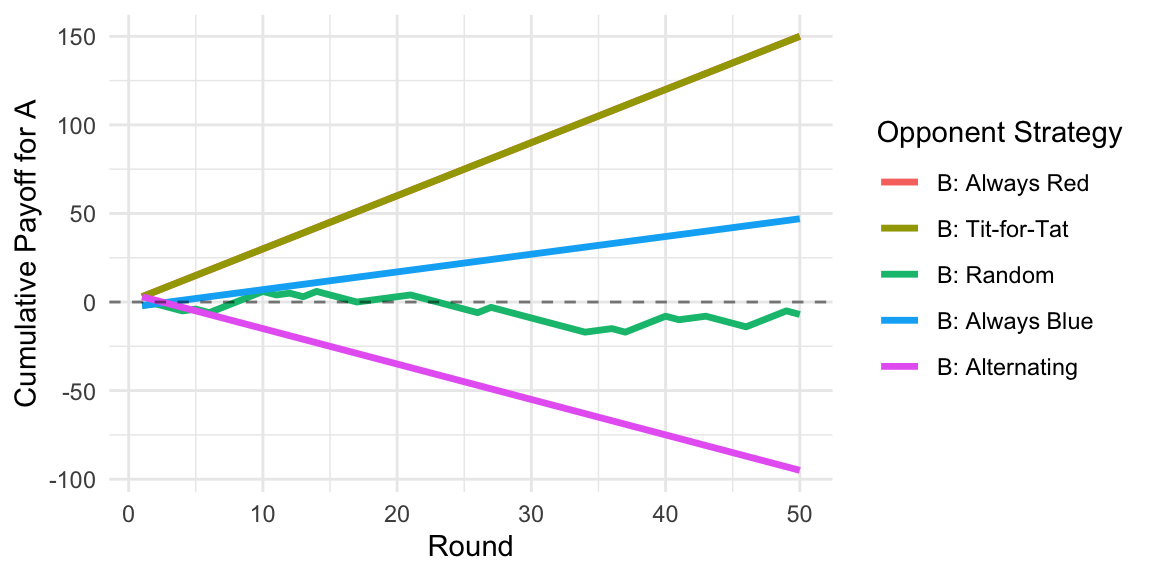 set.seed(17)n_rounds <-50# Payoff function: positive means A wins, negative means B winspayoff <-function(a, b) {if (a == b) {if (a =="R") return(3) elsereturn(1) } else {return(-2) # B wins }}# Tit-for-tat: start with R, then copy opponent's last movetit_for_tat <-function(opponent_history) {if (length(opponent_history) ==0) return("R")return(tail(opponent_history, 1))}# Simulate against different strategiessimulate_game <-function(b_strategy, n = n_rounds) { a_history <-c() b_history <-c() payoffs <-c()for (i in1:n) { a_move <-tit_for_tat(b_history) b_move <-b_strategy(i, a_history) a_history <-c(a_history, a_move) b_history <-c(b_history, b_move) payoffs <-c(payoffs, payoff(a_move, b_move)) }return(cumsum(payoffs))}# B strategiesb_always_red <-function(round, a_hist) "R"b_always_blue <-function(round, a_hist) "B"b_alternating <-function(round, a_hist) if (round %%2==1) "R"else"B"b_random <-function(round, a_hist) sample(c("R", "B"), 1)b_tit_for_tat <-function(round, a_hist) {if (length(a_hist) ==0) return("R")return(tail(a_hist, 1))}# Run simulationsresults <-data.frame(round =1:n_rounds,vs_always_red =simulate_game(b_always_red),vs_always_blue =simulate_game(b_always_blue),vs_alternating =simulate_game(b_alternating),vs_random =simulate_game(b_random),vs_tit_for_tat =simulate_game(b_tit_for_tat))# Plotlibrary(tidyr)results_long <-pivot_longer(results, -round, names_to ="opponent", values_to ="cumulative_payoff")results_long$opponent <-factor(results_long$opponent,levels =c("vs_always_red", "vs_tit_for_tat", "vs_random", "vs_always_blue", "vs_alternating"),labels =c("B: Always Red", "B: Tit-for-Tat", "B: Random", "B: Always Blue", "B: Alternating"))ggplot(results_long, aes(x = round, y = cumulative_payoff, color = opponent)) +geom_line(size =1.2) +geom_hline(yintercept =0, linetype ="dashed", alpha =0.5) +labs(x ="Round", y ="Cumulative Payoff for A", color ="Opponent Strategy") +theme_minimal() +theme(legend.position ="right")