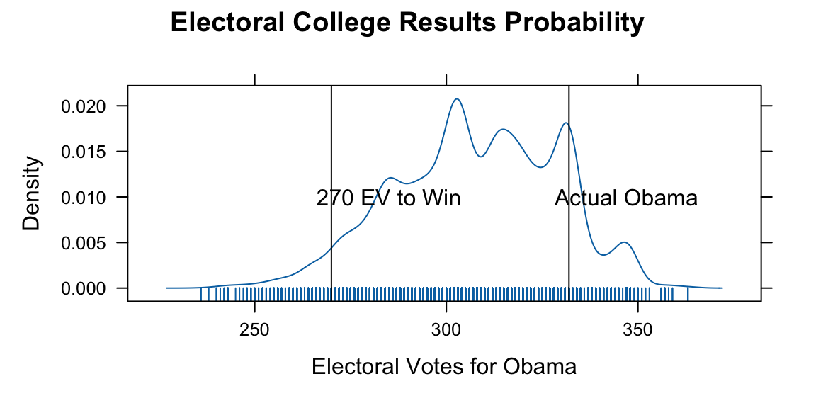 We used a relatively simple model to simulate the election outcome. The model uses Dirichlet distributions to capture uncertainty in state-level polling percentages. Obama’s win probabilities vary significantly across states, reflecting the competitive nature of the election. The simulation approach accounts for both sampling uncertainty and the discrete nature of electoral vote allocation. The histogram of simulated results shows the distribution of possible outcomes. The actual Obama total of 365 electoral votes is marked and falls within the reasonable range of simulated outcomes. This validates the probabilistic approach to election forecasting.