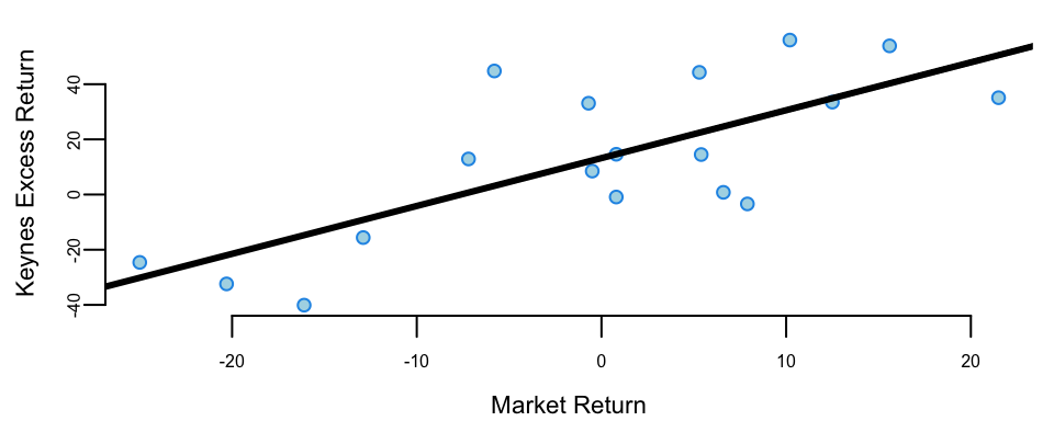 The blue dots on Figure 12.1 below shows the relationship scatterplot of the market returns vs Keynes portfolio returns. The correlation coefficient is 0.76, which is high; when markets are doing well, Keynes also did well.