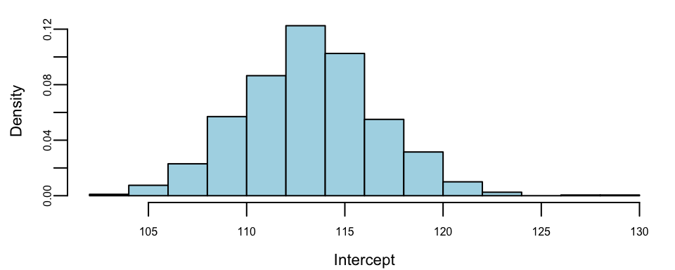 We see that after the adjustment, the intercept \(\alpha=14.46\) is now even larger.