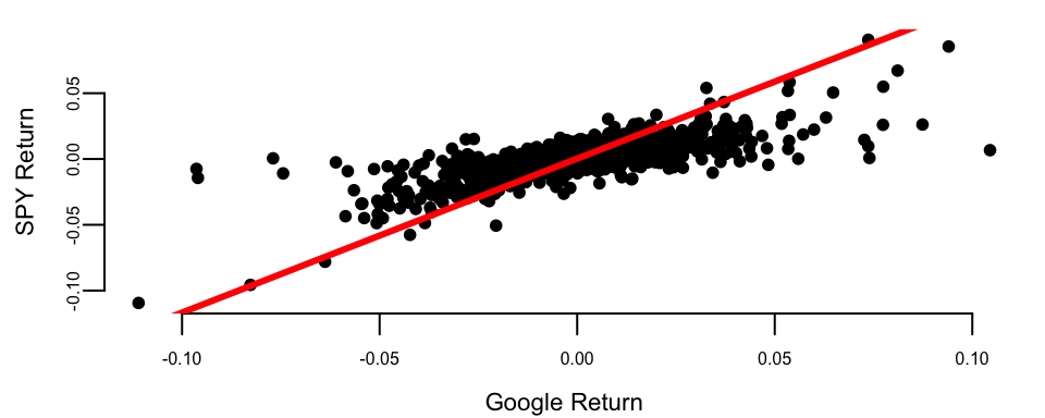 Now we fit a linear regression model \[ \text{Keynes} = \alpha + \beta \text{Market} \] Note that here instead of generic notations \(\beta_0\) for intercept and \(\beta_1\) for slope, we use \(\alpha\) and \(\beta\), which are common in finance literature.