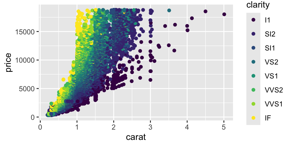 We can see that for small and large diamonds, the price is consistently low and does not depend much on the clarity. However, at around 1 carat, we see some overlap in the price for different clarity levels. Clarity becomes important at this level.