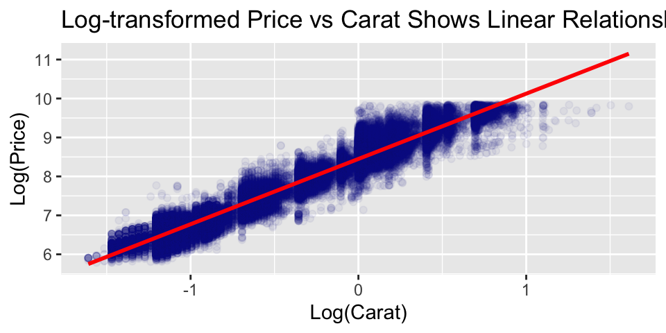 Let’s plot price vs carat. Notice the strong non-linear relationship between carat and price. This suggests that log-transformations might help make the relationship linear.