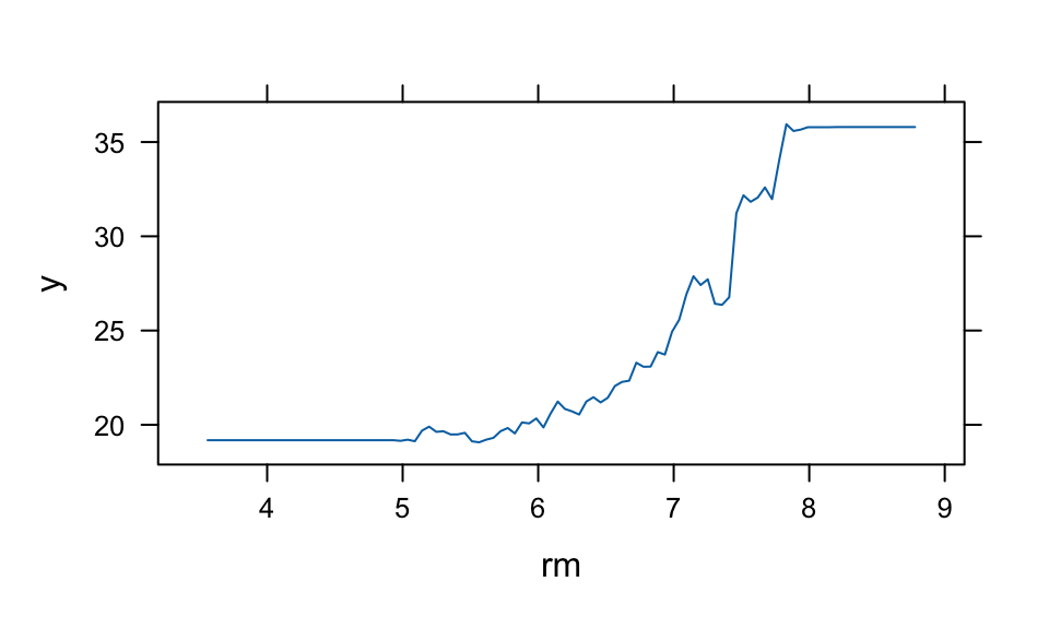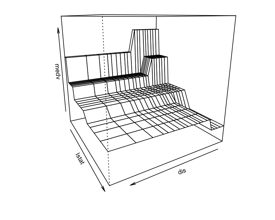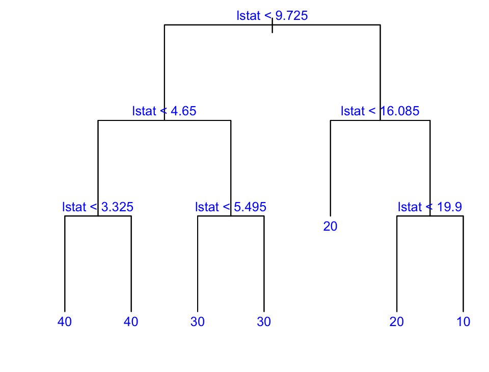 The prediction using a tree is straightforward. The tree divides the predictor space-that is, the set of possible values for \(x_1, x_2, \ldots, x_p\) - into \(J\) distinct and non-overlapping boxes, \(R_1,R_2,...,R_J\). For every observation that falls into the region \(R_j\), we make the same prediction, which is simply the mean of the response values for the training observations in \(R_j\). \[ f(x) = \bar y_j, \text{ for } x \in R_j, \text{ where } \bar y_j = \text{Average}(y_i \mid x_i \in R_j) \]