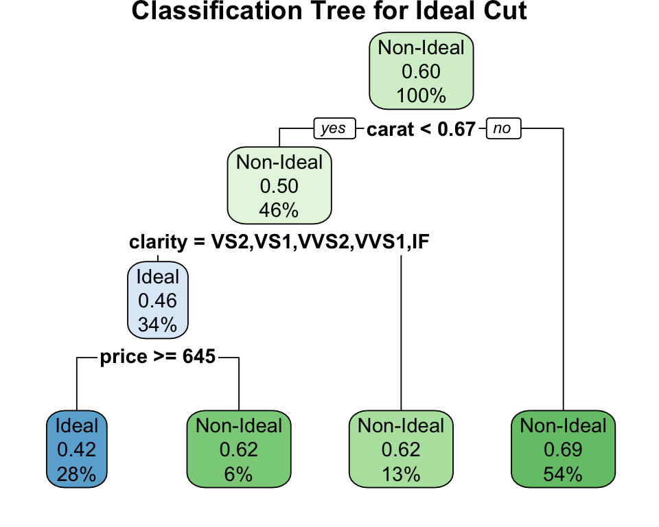 Interpretability: Each leaf shows the predicted price. For example, diamonds with carat < 1.05 and lower clarity (I1, SI2, SI1) have predicted price $2,847.
