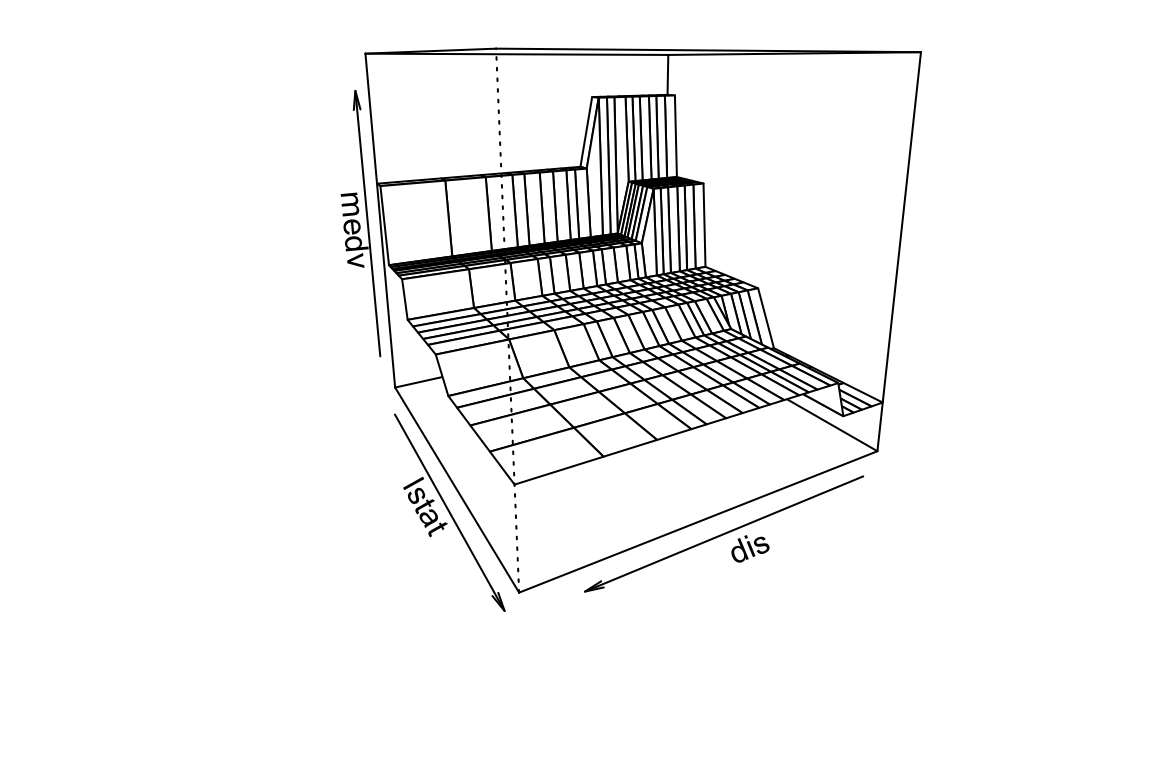 The prediction using a tree is straightforward. The tree divides the predictor space-that is, the set of possible values for \(x_1, x_2, \ldots, x_p\) - into \(J\) distinct and non-overlapping boxes, \(R_1,R_2,...,R_J\). For every observation that falls into the region \(R_j\), we make the same prediction, which is simply the mean of the response values for the training observations in \(R_j\). \[