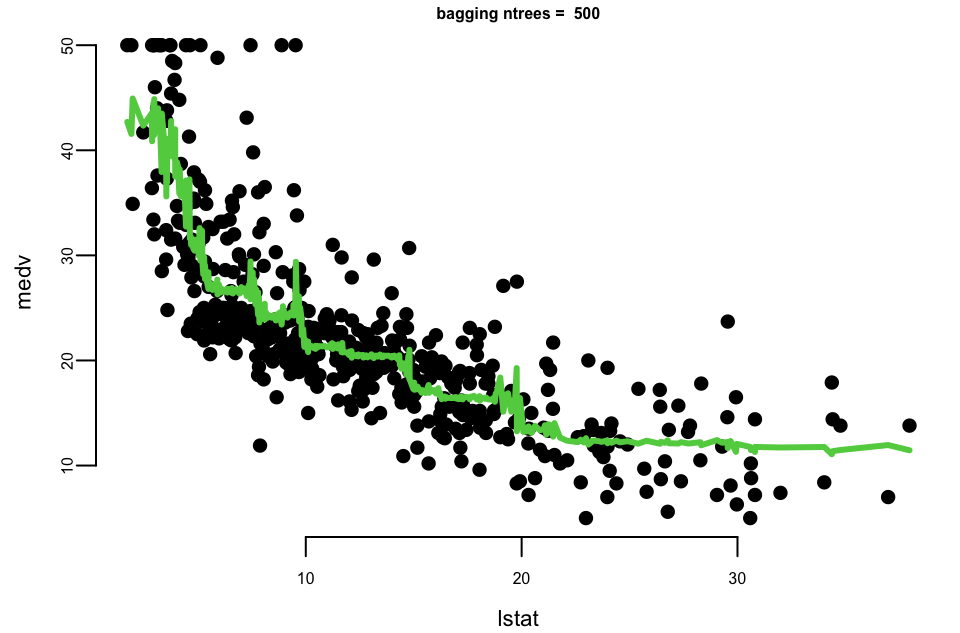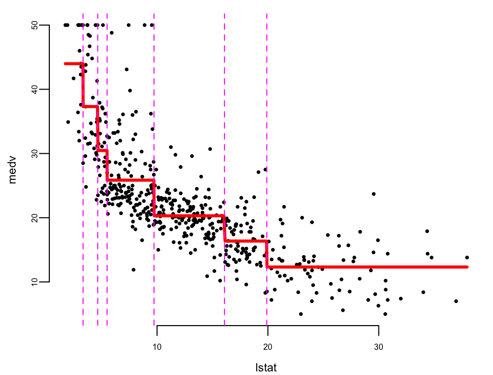 lines(Boston$lstat[oo], boston.fit[oo], col = "red", lwd = 3) # step function fit