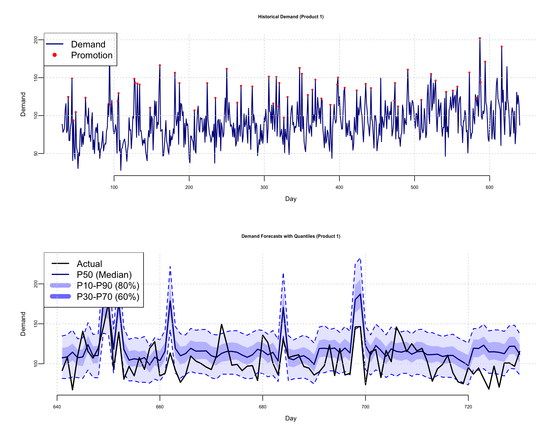 The figure visualizes both historical patterns and probabilistic forecasts. The top panel displays historical demand for Product 1 from the training period, revealing the complex interplay of trend, seasonality, and promotional effects (marked in red). Demand oscillates around an upward trend with clear weekly and monthly cycles, punctuated by sharp spikes during promotional periods.