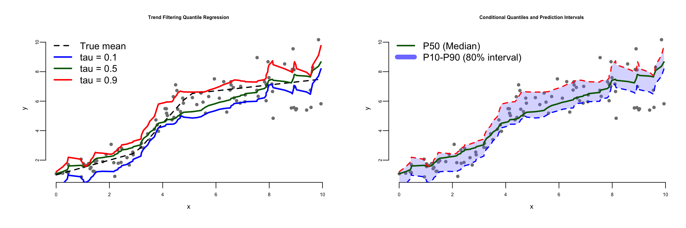 Figure 21.2 illustrates trend filtering quantile regression on synthetic data with heteroskedastic noise. The left panel shows how different quantile levels adapt to the nonlinear underlying structure. The 10th percentile (\(\tau=0.1\)) tracks the lower boundary of the data cloud, the median (\(\tau=0.5\)) estimates the central tendency, and the 90th percentile (\(\tau=0.9\)) follows the upper boundary. Each estimated quantile function captures both the smooth regions and the more abrupt transitions in the data without requiring parametric assumptions about the functional form.