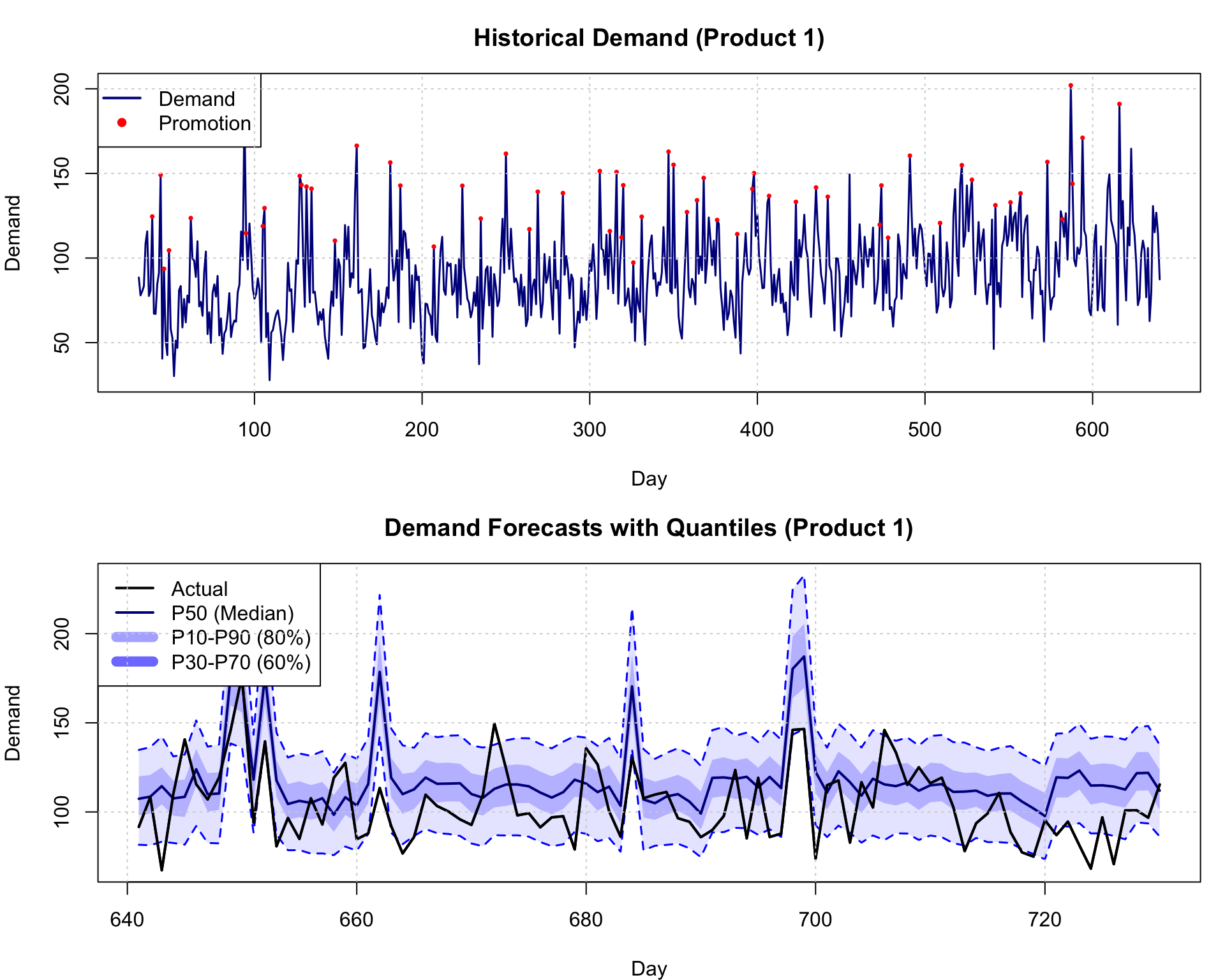 We now provide a complete R implementation for demand forecasting using quantile neural networks. This example simulates realistic demand data with seasonality, trends, and promotional effects, then trains a quantile model to forecast the entire demand distribution.