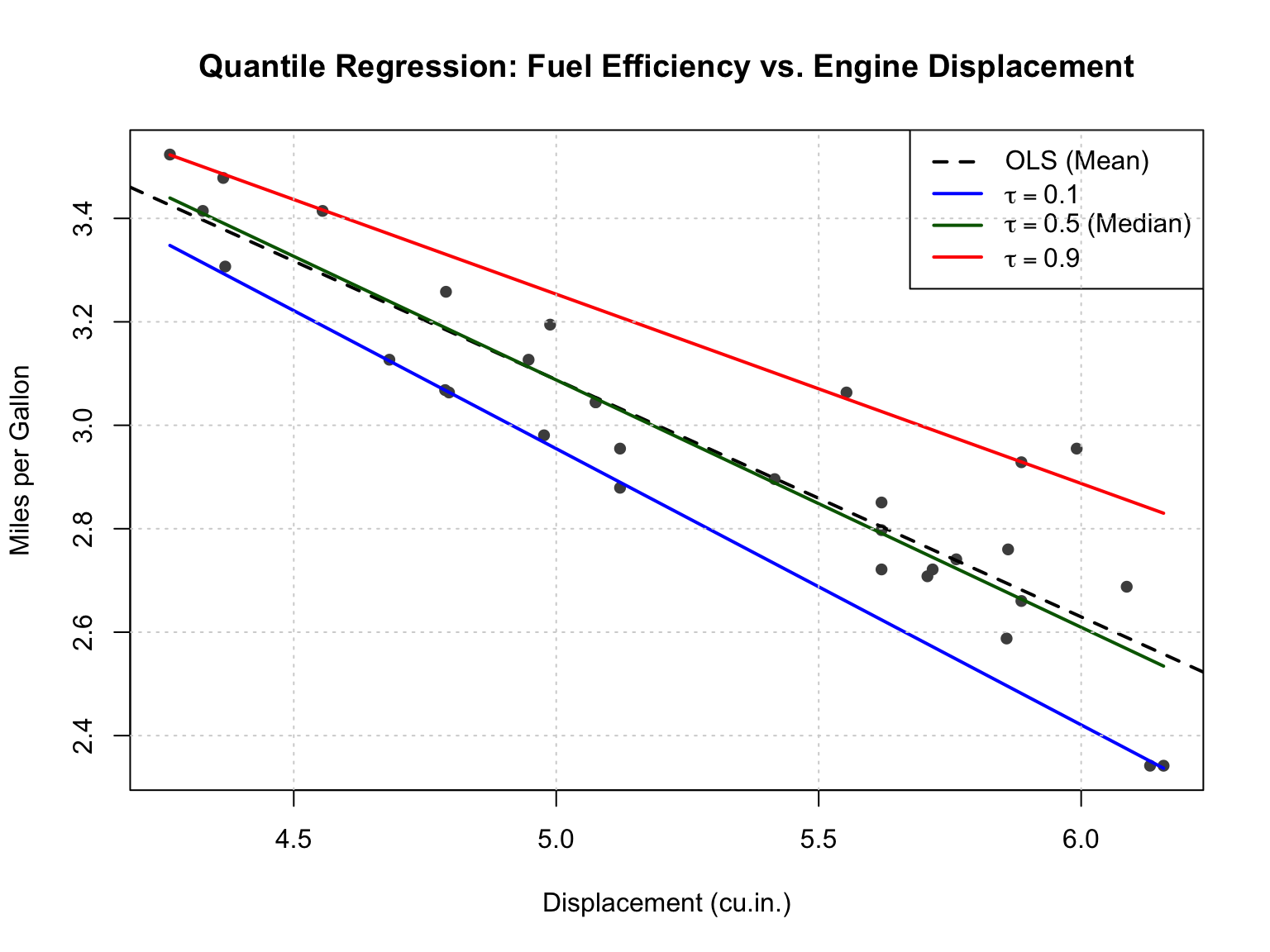 # Also fit OLS for comparisonols_model <-lm(log(mpg) ~log(disp), data = mtcars)# Create visualizationplot(log(mtcars$disp), log(mtcars$mpg), pch =16, col ="gray30",xlab ="Displacement (cu.in.)", ylab ="Miles per Gallon",main ="Quantile Regression: Fuel Efficiency vs. Engine Displacement")# Add regression linesdisp_range <-seq(min(log(mtcars$disp)), max(log(mtcars$disp)), length.out =100)# OLS lineabline(ols_model, col ="black", lwd =2, lty =2)# Quantile regression linescolors <-c("blue", "darkgreen", "red")for (i inseq_along(quantiles)) { tau <- quantiles[i] beta <- results[[as.character(tau)]]$coefficients# Predicted values: y = beta_0 + beta_1 * x pred <- beta[1] + beta[2] * disp_rangelines(disp_range, pred, col = colors[i], lwd =2)}# Add legendlegend("topright", legend =c("OLS (Mean)", expression(tau ==0.1),expression(tau ==0.5~"(Median)"),expression(tau ==0.9)),col =c("black", colors),lty =c(2, 1, 1, 1),lwd =2,bg ="white")grid()