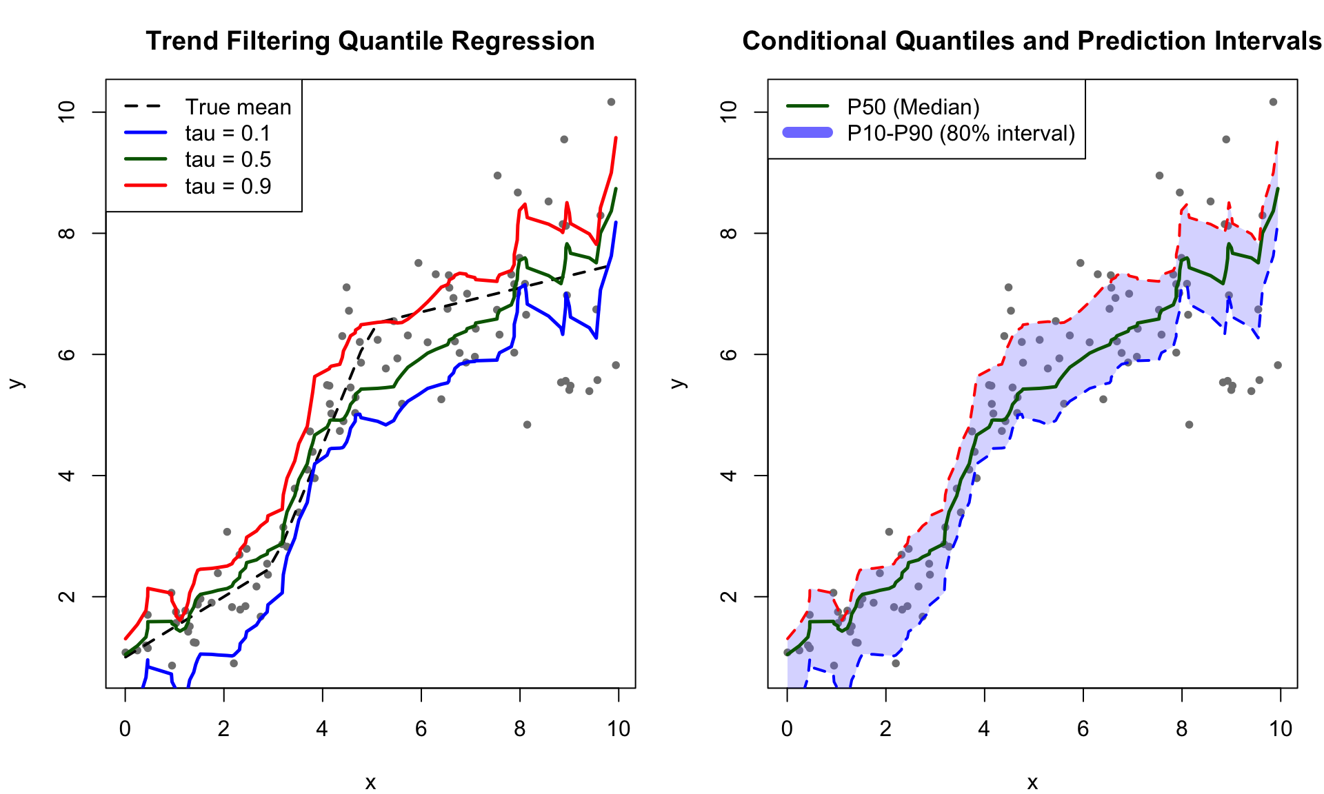 # Set seed for reproducibilityset.seed(123)# Generate nonlinear synthetic data with heteroskedasticityn <-100x <-sort(runif(n, 0, 10))# True function with different regimesf_true <-ifelse(x <3, 1+0.5* x,ifelse(x <5, 2.5+2* (x -3),6.5+0.2* (x -5)))# Heteroskedastic noise that increases with xsigma <-0.3+0.1* xy <- f_true +rnorm(n, 0, sigma)# Define second-order difference operatorD2 <-function(n) { D <-matrix(0, n -2, n)for (i in1:(n -2)) { D[i, i:(i +2)] <-c(1, -2, 1) }return(D)}# Trend filtering objective function for quantile regressiontrend_filter_obj <-function(f, y, lambda, tau, D) {# Check loss residuals <- y - f quantile_loss <-sum(residuals * (tau - (residuals <0)))# L1 penalty on second differences penalty <- lambda *sum(abs(D %*% f))return(quantile_loss + penalty)}# Fit trend filtering for multiple quantiles using optim# For better performance, we use BFGS with box constraintsquantiles <-c(0.1, 0.5, 0.9)lambda <-2.0# Smoothing parameterD <-D2(n)results_tf <-list()for (tau in quantiles) {# Initialize with linear quantile regression X_init <-cbind(1, x) init_fit <-lm(y ~ x) f_init <-predict(init_fit)# Optimize using L-BFGS-B opt_result <-optim(par = f_init,fn = trend_filter_obj,y = y,lambda = lambda,tau = tau,D = D,method ="L-BFGS-B" ) results_tf[[as.character(tau)]] <- opt_result$par}# Visualizationpar(mfrow =c(1, 2), mar =c(4, 4, 3, 1))# Left panel: Data and trend filtering estimatesplot(x, y, pch =16, col ="gray50", cex =0.8,xlab ="x", ylab ="y",main ="Trend Filtering Quantile Regression")# True functionlines(x, f_true, col ="black", lwd =2, lty =2)# Quantile estimatescolors <-c("blue", "darkgreen", "red")for (i inseq_along(quantiles)) { tau <- quantiles[i]lines(x, results_tf[[as.character(tau)]], col = colors[i], lwd =2.5)}legend("topleft", legend =c("True mean", "tau = 0.1", "tau = 0.5", "tau = 0.9"),col =c("black", colors),lty =c(2, 1, 1, 1),lwd =c(2, 2.5, 2.5, 2.5),bg ="white")# Right panel: Uncertainty quantificationplot(x, y, pch =16, col ="gray50", cex =0.8,xlab ="x", ylab ="y",main ="Conditional Quantiles and Prediction Intervals")# Fill prediction intervalspolygon(c(x, rev(x)),c(results_tf[["0.1"]], rev(results_tf[["0.9"]])),col =rgb(0.5, 0.5, 1, 0.3), border =NA)# Quantile curveslines(x, results_tf[["0.1"]], col ="blue", lwd =2, lty =2)lines(x, results_tf[["0.5"]], col ="darkgreen", lwd =2.5)lines(x, results_tf[["0.9"]], col ="red", lwd =2, lty =2)legend("topleft", legend =c("P50 (Median)", "P10-P90 (80% interval)"),col =c("darkgreen", rgb(0.5, 0.5, 1)),lwd =c(2.5, 8),bg ="white")