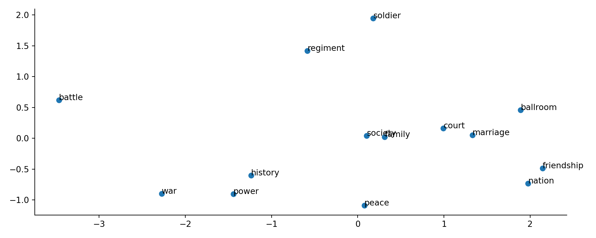 The results reveal meaningful semantic relationships within the text and highlight several key insights into the thematic structure of Tolstoy’s War and Peace. First, the clustering of military-related terms (soldier, regiment, battle) underscores Word2Vec’s ability to group semantically related words based on their co-occurrence patterns. Additionally, the grouping of words such as “ballroom,” “court,” and “marriage” reflects the novel’s emphasis on aristocratic society and its social hierarchy. The use of PCA for dimensionality reduction effectively preserves meaningful relationships while reducing the original high-dimensional Word2Vec space (100 dimensions) to a two-dimensional representation. Overall, this visualization demonstrates how Word2Vec captures distinct thematic domains, including military, social, and government. Notice that a more abstract concept like peace is surrounded by words from both government (history, power, war) and social domains (family, friendship, marriage,court, ballroom, society), indicating its central role in the narrative but is distant from the military domain, which is more focused on the war aspect of the story.