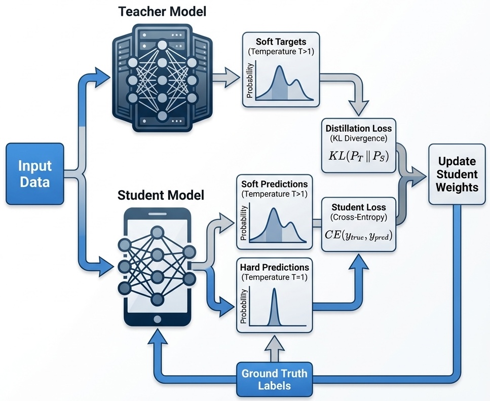Distillation trains a smaller “Student” model to mimic these “soft targets” (the probability distributions) produced by the Teacher. By doing so, the Student learns how the Teacher generalizes, not just what the Teacher predicts.