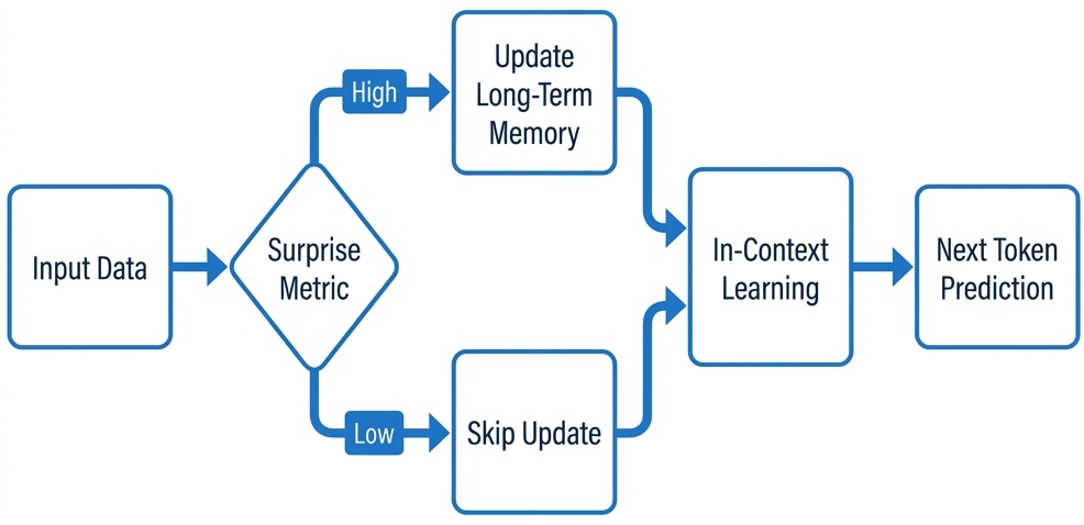 Crucially, this memory is updated during inference, not just during training. Unlike standard Transformers where weights are fixed after training, Titans update the weights of this memory MLP on the fly for each new input. Updates are triggered by a “surprise signal,” computed from gradient magnitudes—conceptually similar to how biological brains strengthen synapses when there is a prediction error. This moves AI toward continual learning without the need to retrain the entire model.